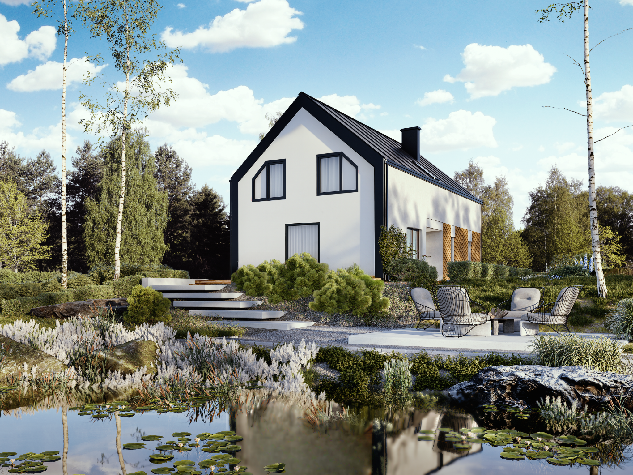 W projekcie zastosowano nowoczesne ściany dyfuzyjnie otwarte, które zapewniają zdrowy mikroklimat we wnętrzach. Dzięki możliwości „oddychania” konstrukcji i odprowadzania wilgoci na zewnątrz, dom pozostaje suchy, ciepły i przyjazny dla domowników przez cały rok. Ściany zachowują również bardzo dobre właściwości izolacyjne, co przekłada się na niższe rachunki za ogrzewanie.