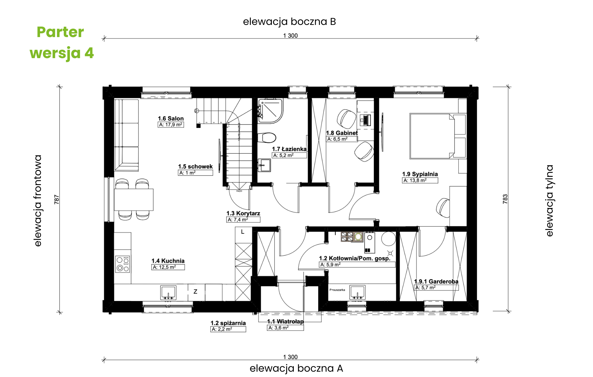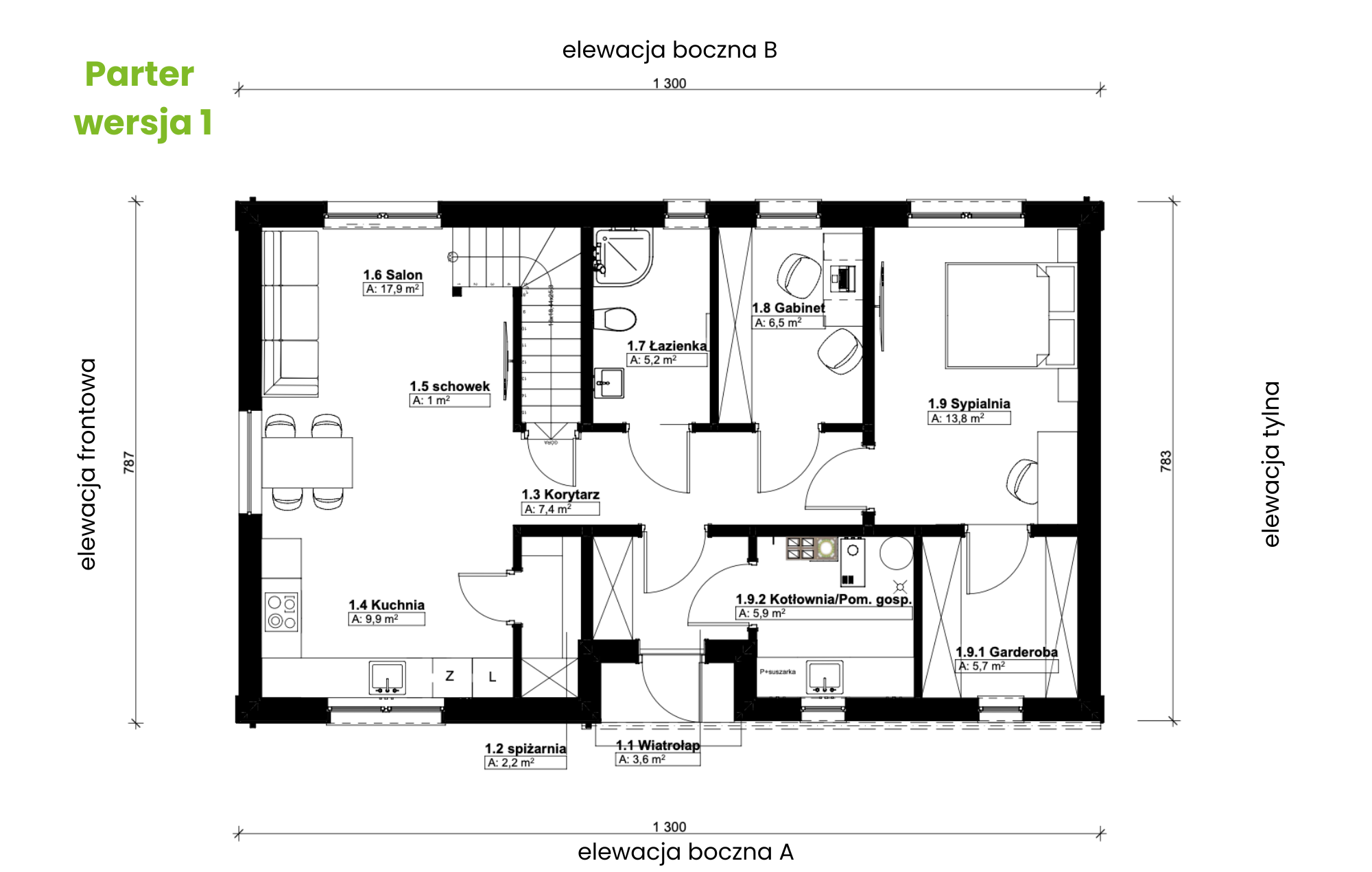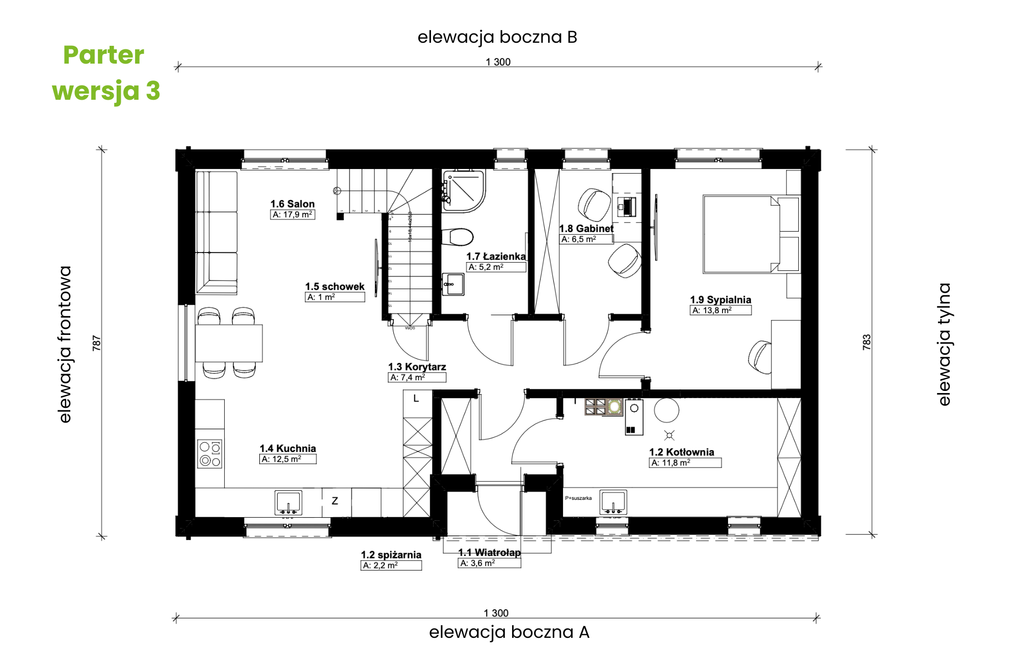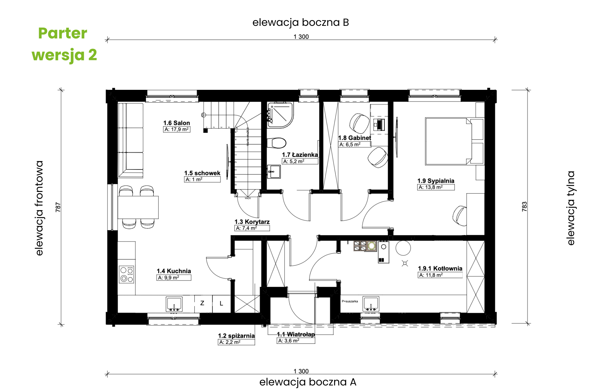 Na parterze zaplanowano czytelny układ pomieszczeń. Z wiatrołapu dostajemy się do kotłowni oraz części mieszkalnej. W przestronnej kotłowni z łatwością można wygospodarować miejsce na pralkę i suszarkę. W części mieszkalnej – po lewej stronie znajduje się jasna, otwarta strefa dzienna: kuchnia z wydzieloną spiżarnią, jadalnia oraz salon z dużymi przeszkleniami i bezpośrednim wyjściem do ogrodu.
