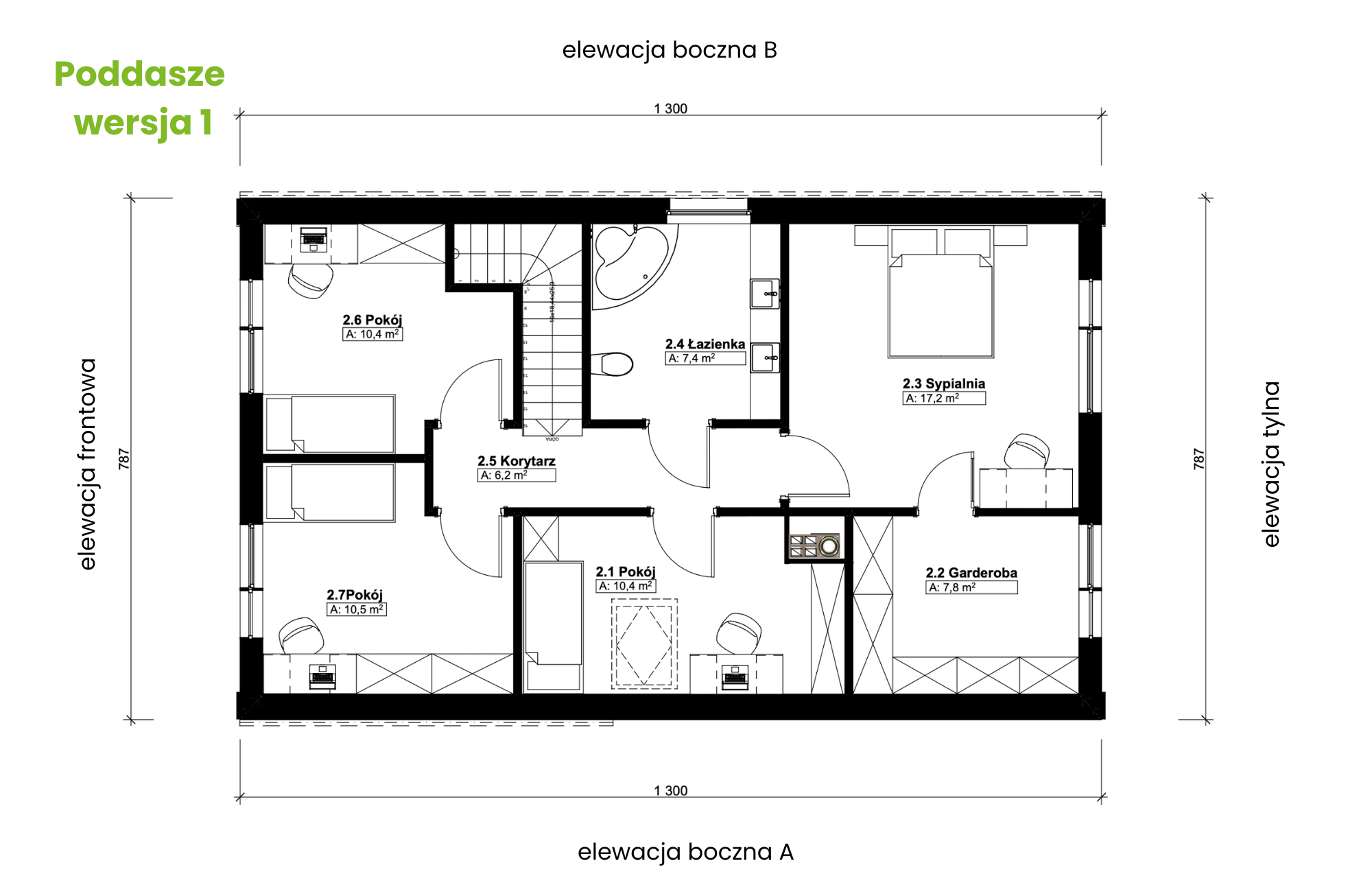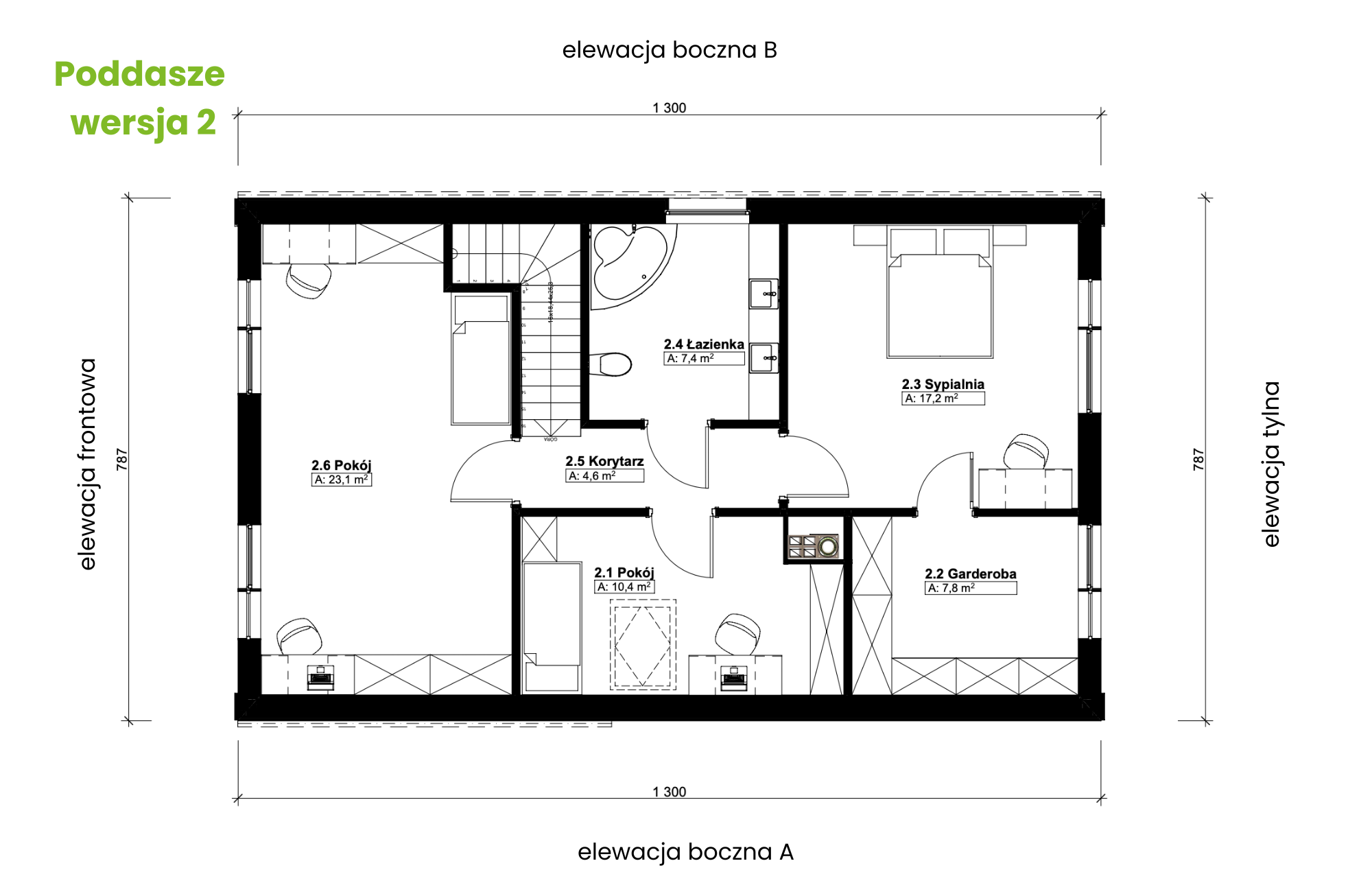 - na piętrze: możliwość zredukowania liczby pokoi do trzech poprzez połączenie dwóch mniejszych w jedną przestronną sypialnię o powierzchni ponad 20 m².